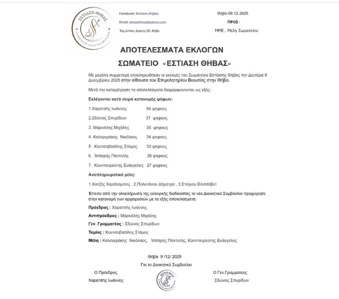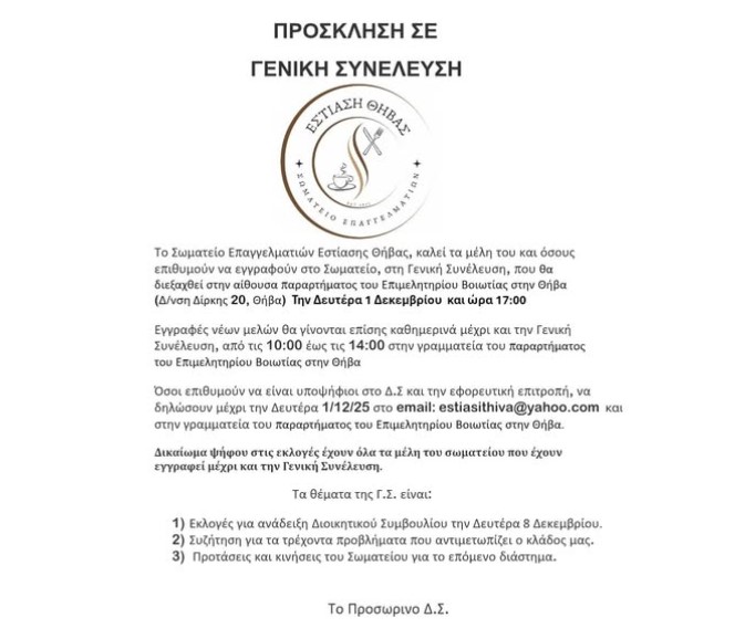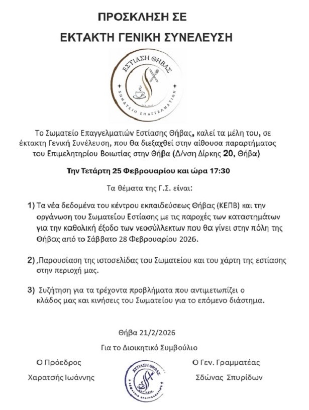 Το Σωματείο Εστίασης Θήβας καλεί τα μέλη του, σε έκτακτη Γενική Συνέλευση Την Τετάρτη 25 Φεβρουαρίου και ώρα 17:30.