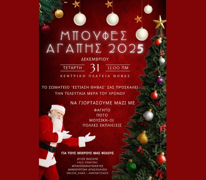 Την τελευταία ήμερα του χρόνου γιορτάζουμε μαζί στην κεντρική πλατεία της Θήβας με φαγητό, ποτό , μουσική dj και πολλές...