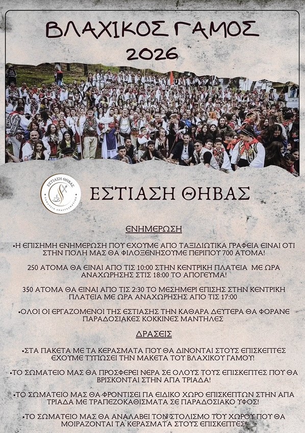 Το Σωματείο Εστίασης Θήβας σας προσκαλεί στο έθιμο του Βλάχικου Γάμου που αναβιώνει στην πόλη μας!